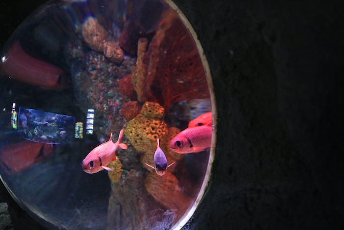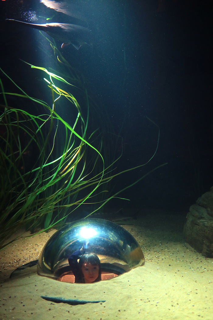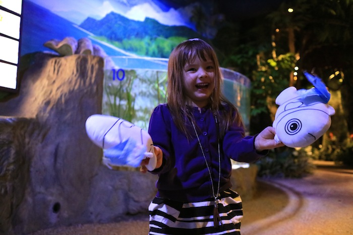 Tällä kertaa meidän kierros alkoi koralliriuttojen kalojen ruokinnalla. Esikoinen sai tiputella lusikalla ruokaa jättimäiseen akvaarioon, jossa kalat innostuivat sapuskasta ja roiskottivat vettä altaan ulkopuolellekin. Lasten riemua oli ihana seurata! Opas kertoi tarinoita kaloista, kuten sen, miten ne kaikki iltaisin valojen sammuttamisen jälkeen uiskentelevat altaan koloihin nukkumaan. Tämä ohjelmanumerohan on mahdollista nähdä myös kaikille kävijöille tarkoitettuna esityksenä, mutta tilanteesta teki erityisen se, että paikalla olimme vain me ja että esikoinen sai toimia ruokkijana.